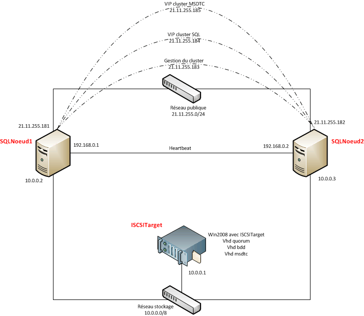 -un réseau virtuel privé pour le heartbeat et le stockage ISCSI 10.0.0.x/8 (normalement il faut un réseau dédié uniquement au stockage ISCSI)