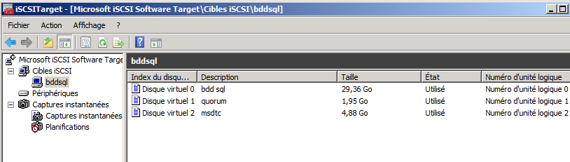 – il suffit ensuite de créer un disque virtuel de 10Go nommé par exemple quorum.vhd, un second de 40Go bddsql.vhd et un troisième de 10Go msdtc.vhd (vous pouvez aussi créer 3 cibles ISCSI et dans chacunes d’elles mettre soit quorum.vhd soit bddsql.vhd soit msdtc.vhd)
