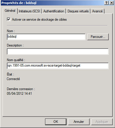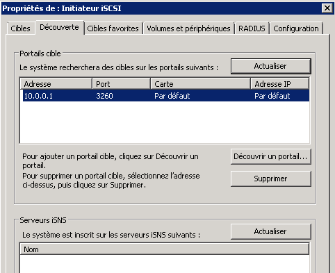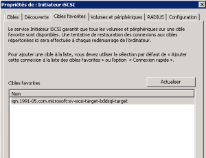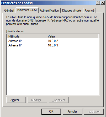 – configurez votre 1ère cible ISCSI en indiquant son nom exemple « bddsql » puis les @IP des clients qui y auront accès, comme l’@IP 10.0.0.x de vos deux noeuds SQL