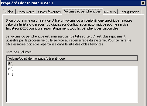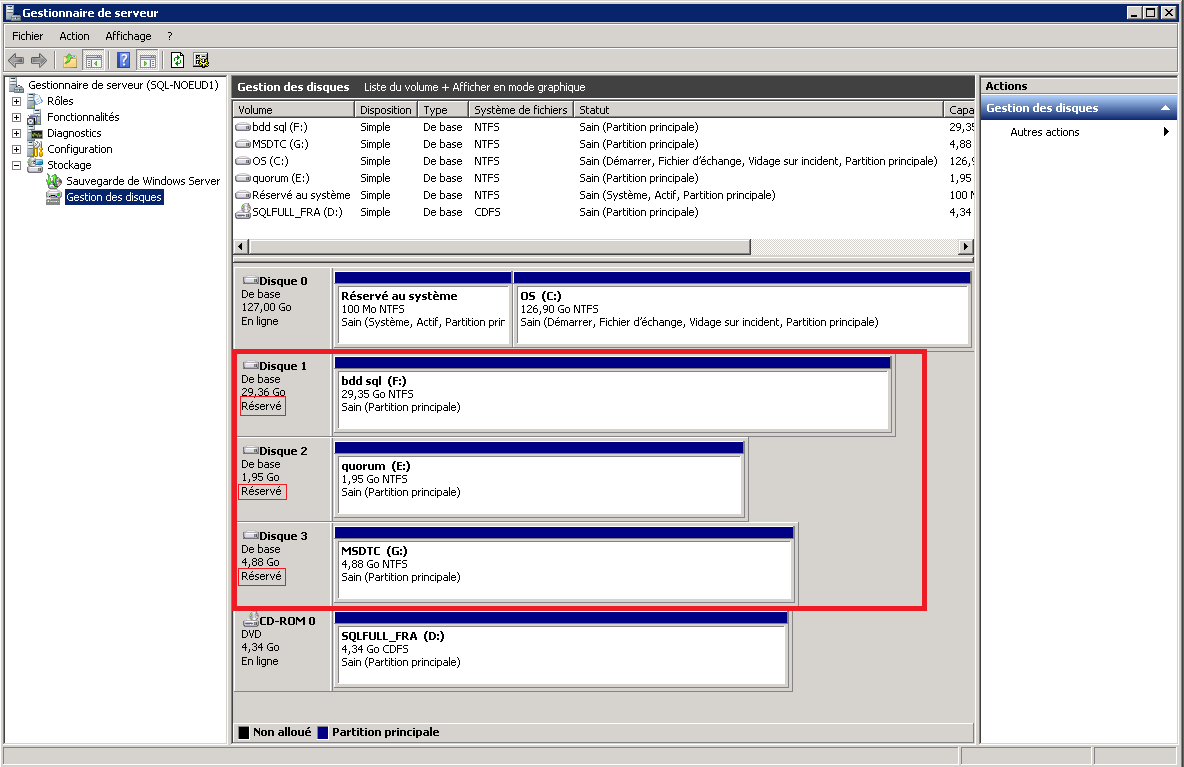 – puis sur SQLNoeud1 par exemple, lancer l’installation de SQL serveur 2008R2 entreprise en mode cluster pour créer le cluster SQL, il vous sera demandé le nom dns du cluster exemple clustersql.domain.com.local, l’@IP virtuelle de ce cluster exemple 21.11.255.x, l’emplacement du quorum, le répertoire où seront stockés les bases de données, ce répertoire devant pointer évidemment sur bddsql.vhd, dans mon cas, F:\quelqueschose\ (vous remarquerez que les disques ISCSI sont marqués comme « réservé » par le système d’exploitation)