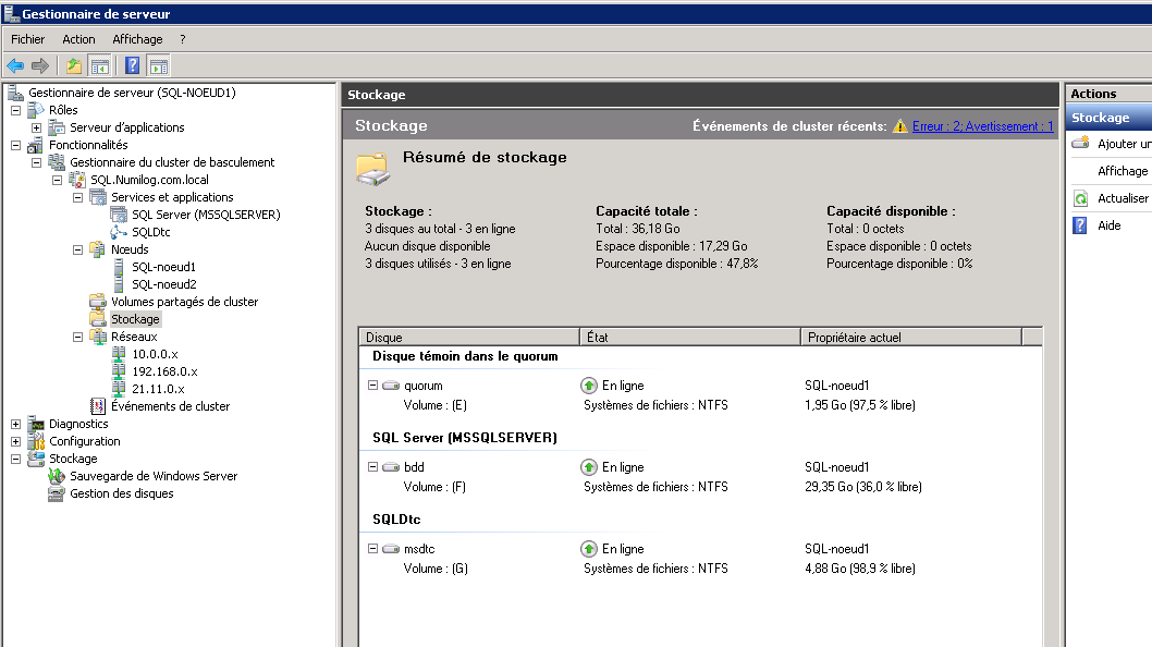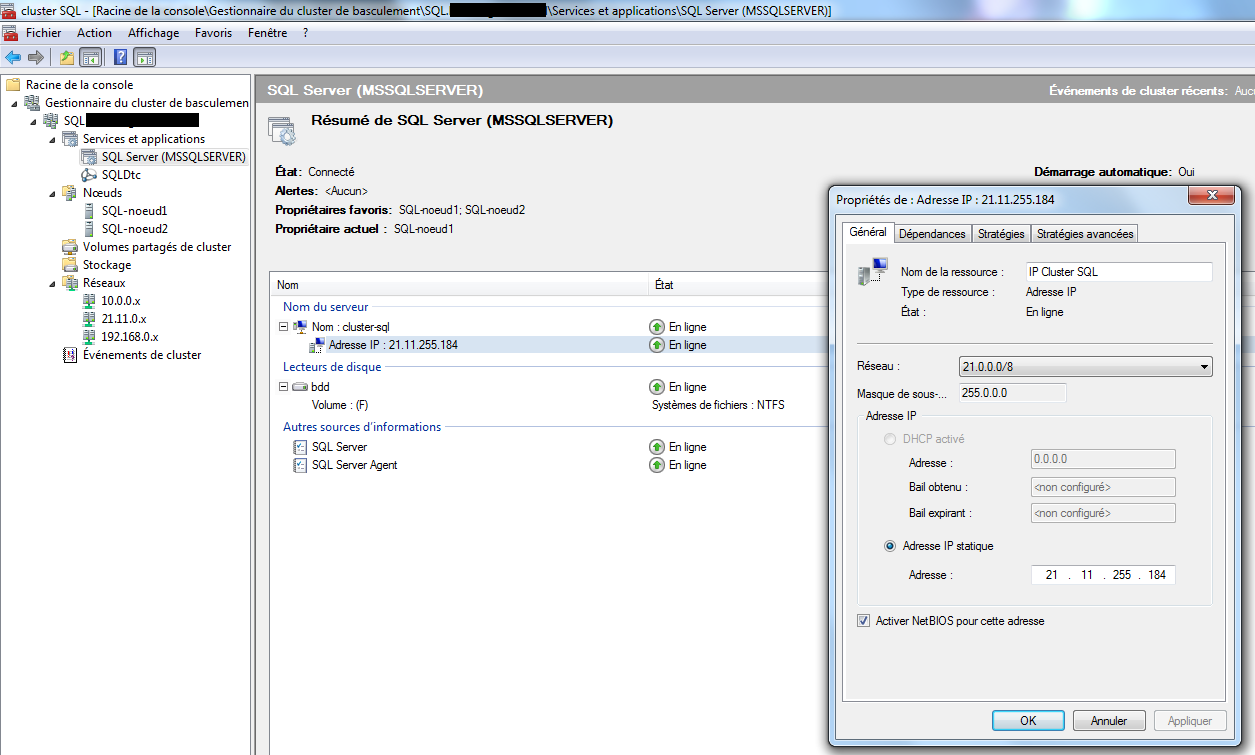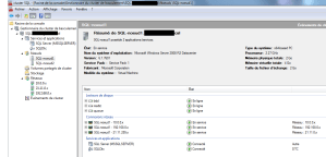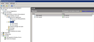 – Dans le gestionnaire de cluster on voit que tous nos noeuds sont actifs, on peut donc s’amuser a arrêter le noeud hébergeant le service SQL et voir que le second noeud prend le relais autormatiquement. Dans mes tests, la perte de connectivité lors du basculement de noeud dure entre 10 à 20s.