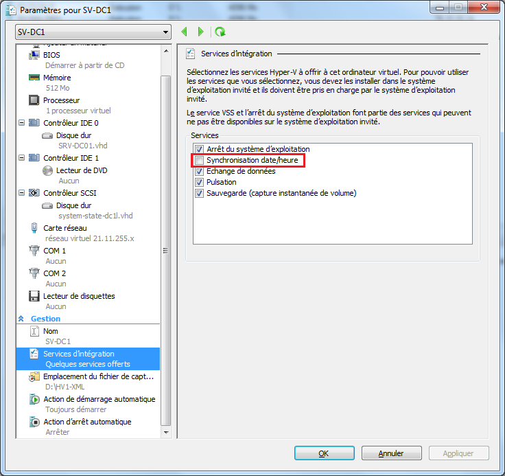 - Décocher la synchro de l’horloge entre la vm et son serveur physique sinon l’horloge du DC continuera de se synchroniser sur le serveur Hyper-V, chez nous les serveurs physique Hyper-V ne font pas partie du domaine donc se synchronise nul part.