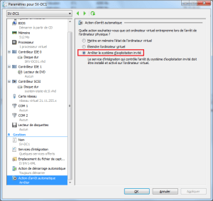 - Spécifier le comportemant de la VM lors d’un reboot de l’hyperviseur, par defaut la machine virtuelle se met dans l’état « enregistré » ce qui peut poser des conflits lors des réplications entre DC par exemple.